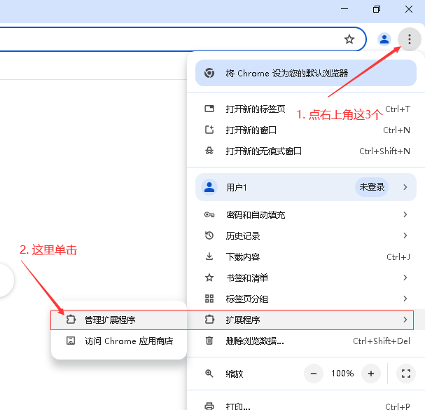 3. 打开谷歌浏览器,按下图所示操作,或者直接在谷歌浏览器中输入 chrome://extensions/